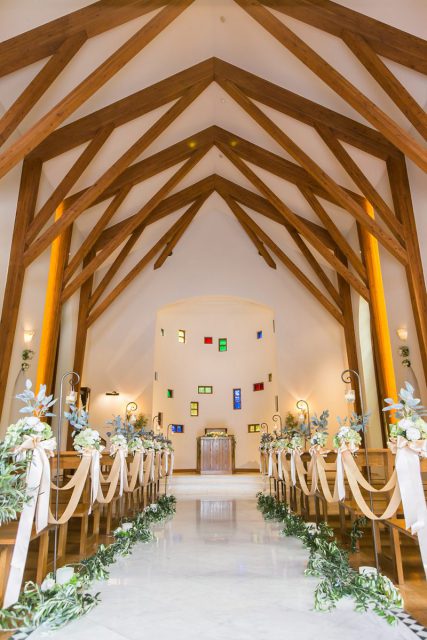 アイボリーを基調とした教会は木の梁が力強さと温もりを感じさせ、ほっとする空間。南仏の街からそのまま抜け出たようなかわいらしい教会です。