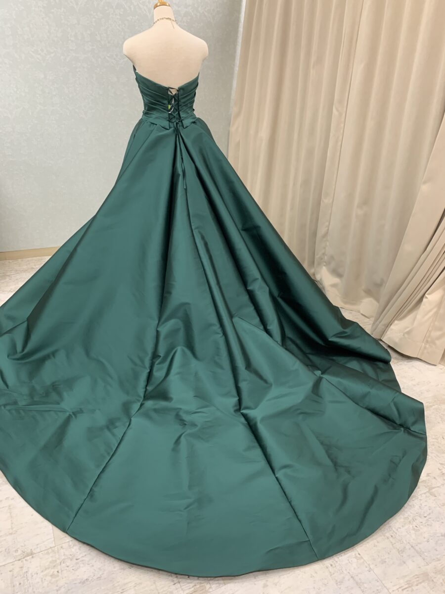 深いグリーンのドレスはパフスリーブとビスチェの2WAY